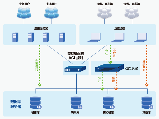 數據庫動態脫敏系統接入數據中心,無需改造業務。識別敏感數據并做好分級分類標簽,通過人員管理、終端管理、工具管理、應用程序管理、訪問操作等多要素進行訪問身份管理,實現了數據庫的準入管理、數據對象的訪問管理、特權用戶的安全規范管理、敏感數據授權訪問管理。